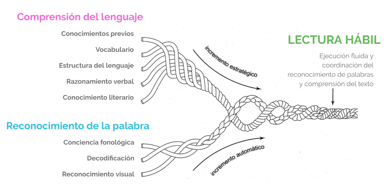 En esta dirección, el Modelo propuesto por Scarborough (2001) ilustra cuáles son los hilos principales que deben trabajarse para poder ser un buen lector y establece que para que se produzca una lectura competente se precisa el desarrollo de dos grandes componentes: